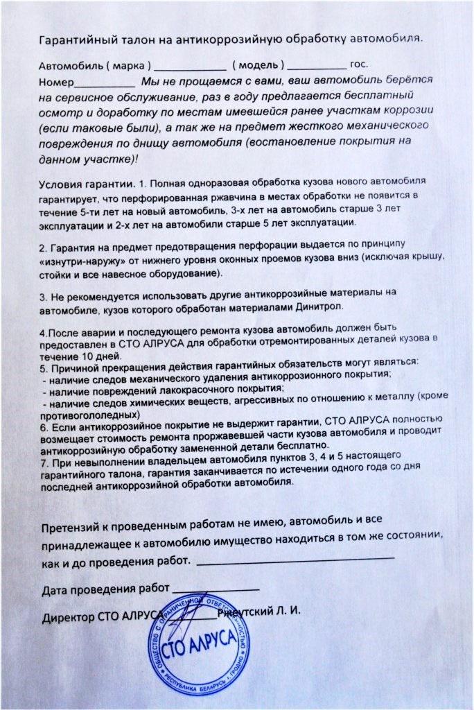 Напоминаем, что гарантийный срок антикоррозийной обработки согласно постановлению Совета Министров Республики Беларусь 1590 от 14.12.2004 действует 6 месяцев со дня обработки. ООО "СТО АЛРУСА" может (но не обязано) на свое усмотрение выдать гарантийный талон на более длительный срок.